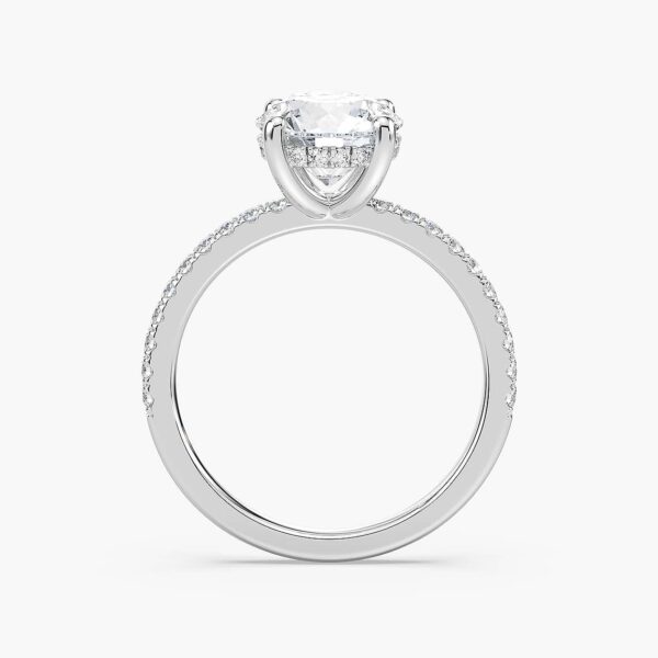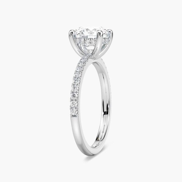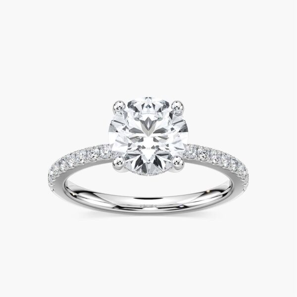 Averine Secret Shine Hidden Halo Engagement Ring blends timeless elegance with modern sophistication. Crafted with a graceful cathedral-style shank, this design showcases a dazzling center stone held in a refined four-prong trellis setting. Nestled just beneath the centerpiece lies a delicate hidden halo of Lab Grown Diamonds, adding brilliance from every angle. This design also features Lab Grown Diamond accents prong-set along the shoulders, enhancing its sparkle while maintaining a refined silhouette. Please note that the starting price includes the setting only. Perfect for those with active routines, this low-profile ring offers both beauty and practicality without compromising on elegance.